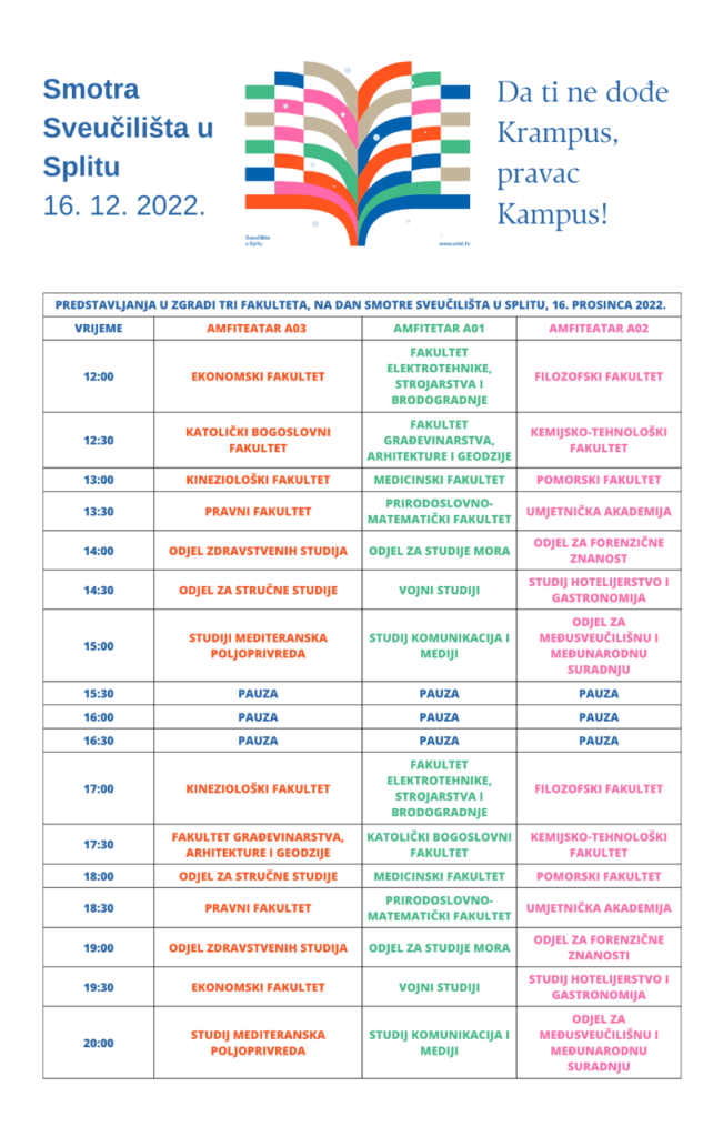 Dragi maturanti donosimo detaljan program Smotre Sveučilišta u Splitu koja će se održati 16. prosinca u auli Prirodoslovno-matematičkog fakulteta.